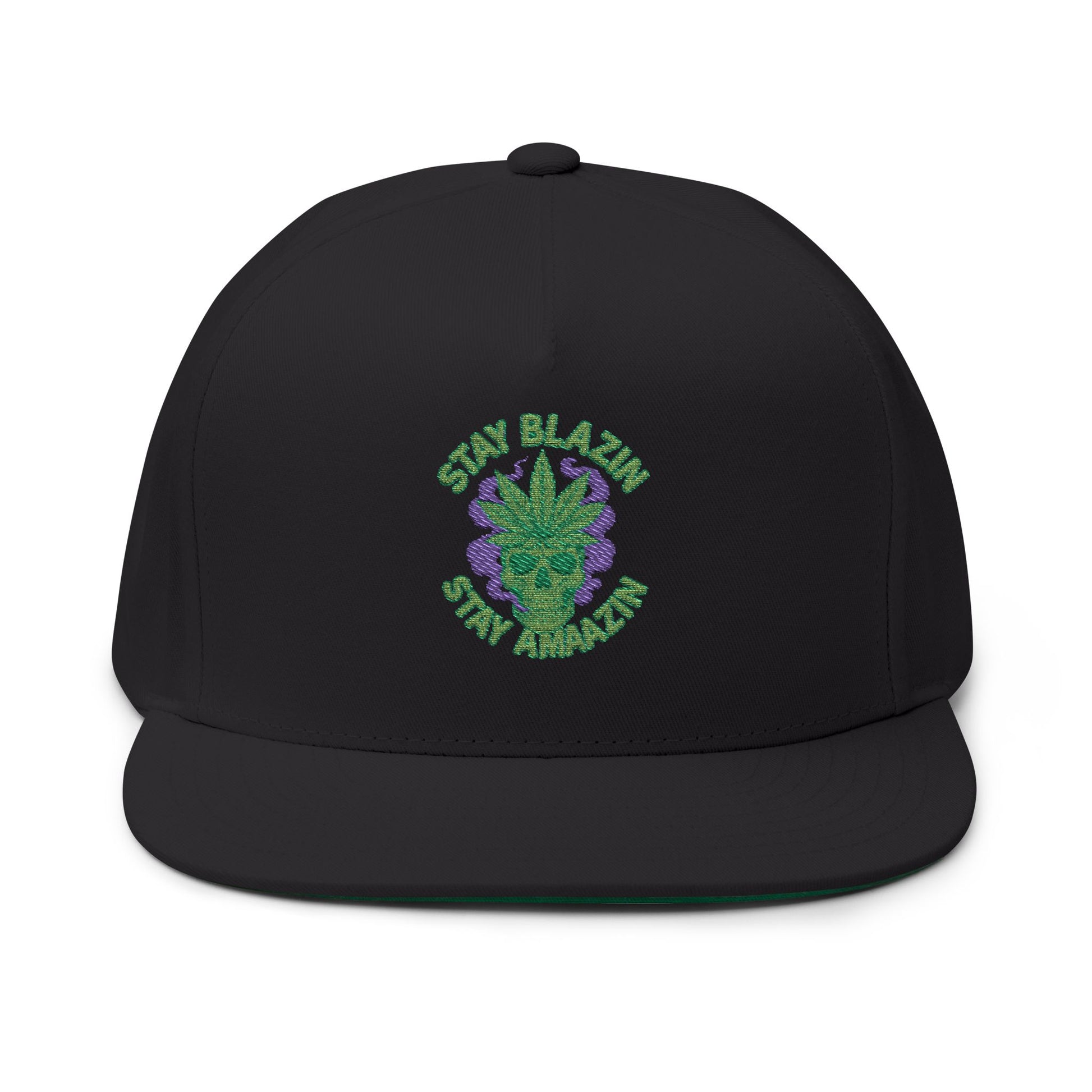 This vibrant graffiti-style trucker hat features a neon green skull crowned with a cannabis leaf, purple smoke swirls, and curved “Stay Blazin Stay Amazin” lettering — a bold tribute to chill days, big hits, and even bigger energy.