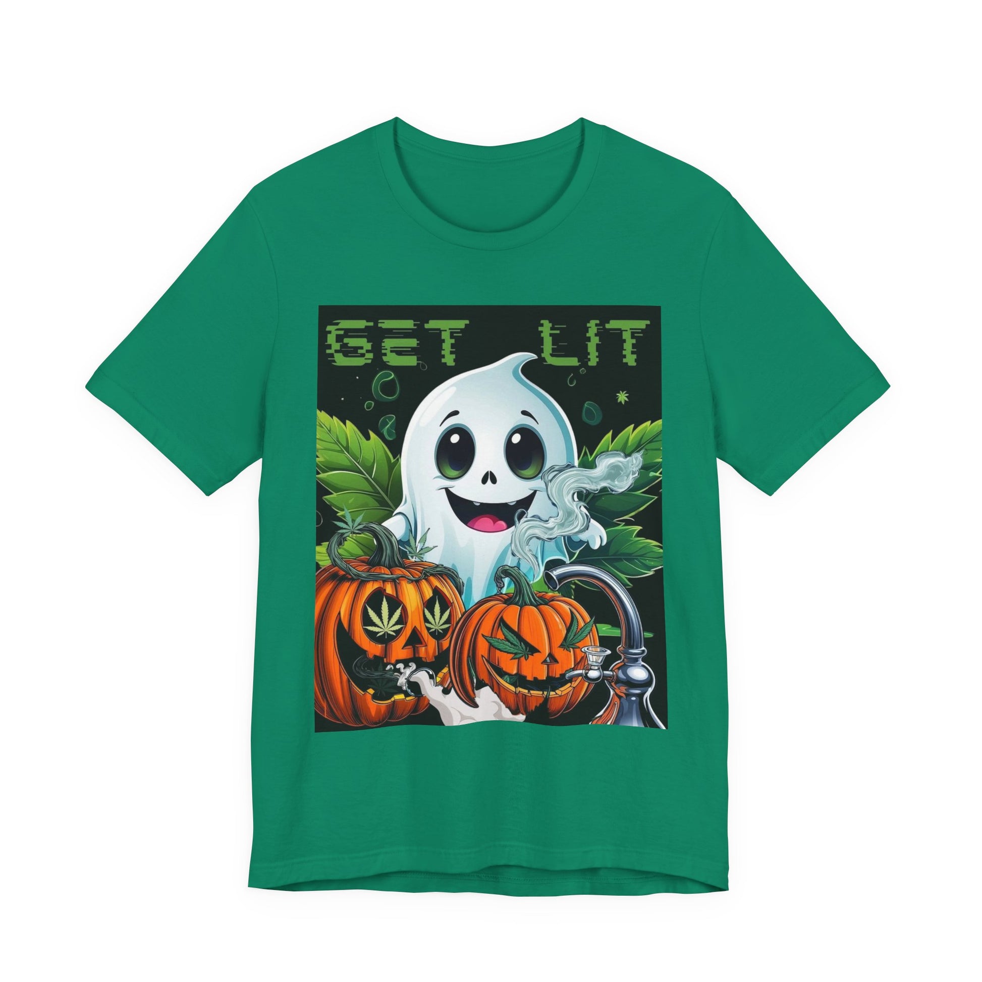 Light up your spooky season with this playful “Get Lit” Halloween tee! Featuring a happy ghost and two mischievous pumpkins with cannabis leaf eyes, this vibrant design blends Halloween fun with chill Mary-Jane vibes. Perfect for stoners, party lovers, or anyone who wants to show off their festive spirit with a twist. Whether you’re carving pumpkins, passing the bong, or hosting a haunted smoke sesh, this shirt keeps the vibe high and the style bold.