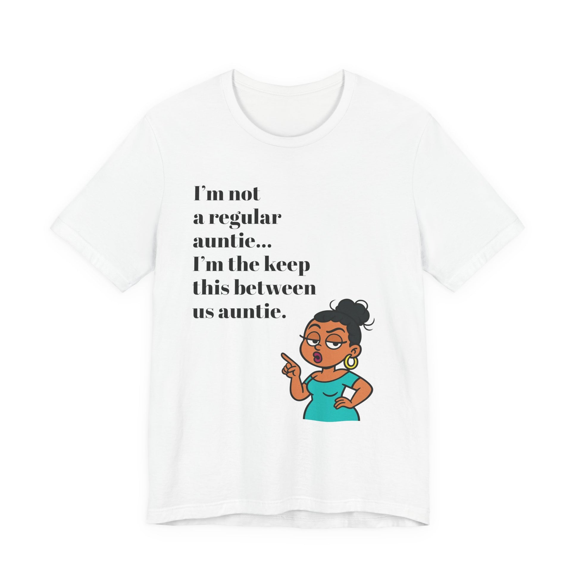 Bring the fun auntie energy everywhere you go with this bold “I’m Not a Regular Auntie… I’m the Keep-This-Between-Us Auntie” tee. Featuring a sassy cartoon blonde auntie with big attitude, this shirt is perfect for the cool aunt who gives advice, spills tea, and keeps secrets.